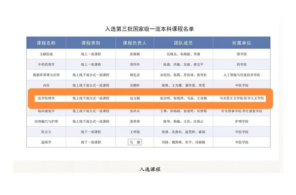 近日,教育部发布《教育部关于公布第三批国家级一流本科课程认定结果的通知》(教高函〔2025〕9号),认定5994门课程为第三批国家级一流本科课程。其中,线上课程1000门,虚拟仿真实验教学课程500门,线下课程1841门,线上线下混合式课程2204门,社会实践课程449门,我院包玉颖老师负责的《医学伦理学》课程获评线上线下混合式一流本科课程,实现学院国家级一流本科课程零的突破,学院课程建设再上新台阶